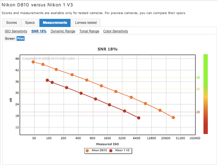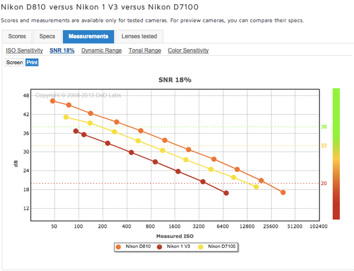 Further comparison with the D7100 (similar with the SONY A6000), DX, shows performance between the V-series and the D810.
