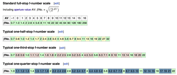 f-number is calculated by the definition N = 2i/2 , where i = 1, 2, 3,... for f/1.4, f/2, f/2.8,...