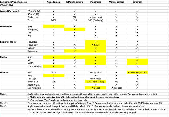 Below is my comparison of the various cameras. This is as of October 2016 and should be considered a moving target since these apps will be updated frequently, adding new features. Other apps may also emerge to take over. I’ll try to keep this up to date.
