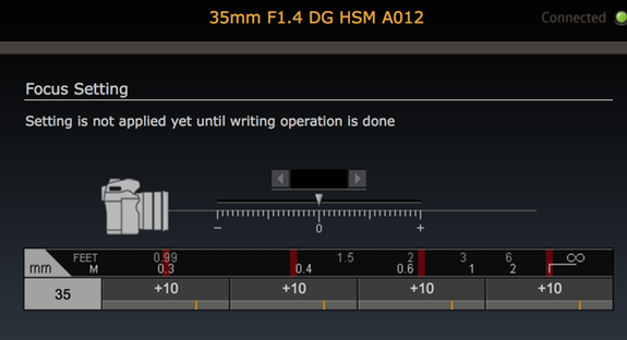 This would require approx +17 correction in camera to correct for this front focus. Instead, I decided to use the SIGMA Optimization Pro software with the attached USB lens carrier to make a correction. I set the correction to +10 across all distances as shown below.