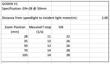 Here you notice there is not so much change in GN as the zoom is changed. The only speculation I have is that the nature of the round head on the V1 makes the light beam less sensitive to zoom factor. Whatever the explanation, handy to know this characterisitc. Notice, however, that the measured results are much closer to the V1 Spec (measured GN = 26@50mm versus 28) and is the same as the SB5000.