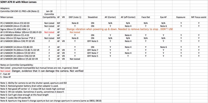 Overall, i think the most useful lenses are the 24mm PC-E, 105mm f/1.4 (with limitations), Zeiss 135mm f/2, Nikon 14-24mm f/2.8 (with limitations), Nikon 70-200mm f/2.8. Even with these lenses, I'd only use "in case of emergency" since this testing didn't do much to improve my confidence that the Commlite adapter is a solid, reliable solution. In particular, my experience with the Sigma 50mm was scary in that the camera started to vibrate, even after I had turned it off. I needed to remove the battery to reset things. And, this is a lens that Commlite has on their compatibility list. Uncertainty over whether Commlite has fully tested with the A7R III is another source of concern.