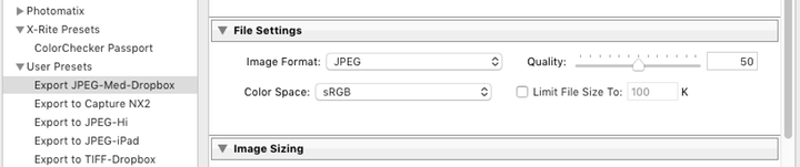 6. Select all in the collection. Go to “Export”. Select the user preset “Export Jpeg-Med-Dropbox”. Specify a (sub)folder and rename the images, then export. The images will be converted to good quality Jpegs and exported to Dropbox for secure storage.