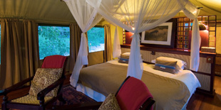 Selinda Camp's nine spacious, luxury tents are erected under cool thatch canopies, with all units having panoramic views across palm-studded floodplains. Each tent has en-suite facilities, a stone bath being the highlight. The bathroom is uniquely "open air" with lots of natural light, yet is screened and virtually insect-proof. The tents are spacious and beautifully appointed with furniture and features that have been collected from around Africa. Four-poster mosquito nets and overhead fans are standard at Selinda Camp.