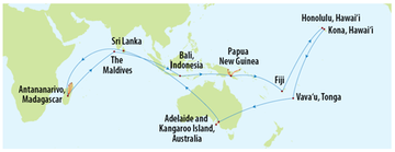 Navigation arrows appear near the top of each page to move between destinations or to return to the Intinerary page.