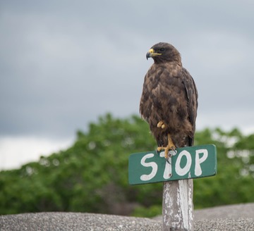 Wednesday, April 9. As we waited for our zodiac to pick us up we met one of the few predators on the Islands - the Galapagos Hawk. He had found a perch to rest which seemed particularly appropriate. like he was guarding the beach.