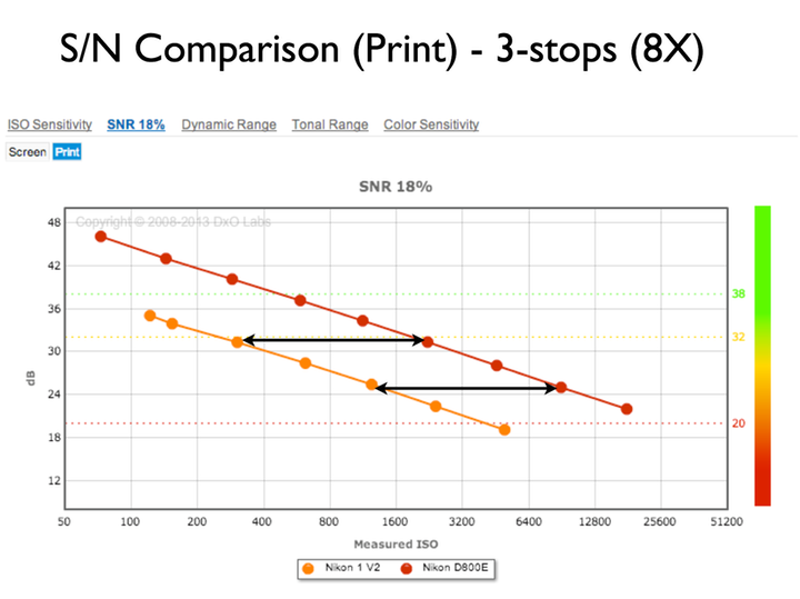 You will notice that, for a given S/N ratio (normalized for a fixed print size), the D800E has approximately 3 stops advantage. That's 8 times. Thus, ISO 200 on the V2 is roughly equivalent (in S/N) to ISO 1600 on the D800E. Per-pixel S/N is much closer but the D800E has the benefit of much higher resolution which improves S/N when downsized to print resolution. Remember this "3-stop" difference since it will arise again when we talk about Depth of Field.