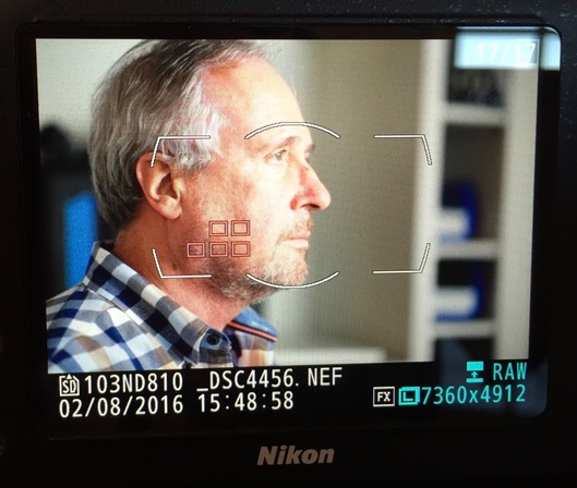 b. Decided to go full manual, wanted to try f/1.8 to see how well the camera focussed. Used an incident light meter to figure out how much flash was required. Unfortunately, the “no-cord” setting on the flash meter did not give the correct reading (maybe something to do with the diffuse light out of the softbox). So, I connected the flash meter to the flash, with a suitable cable, and took a reading. This time it was accurate. However, since the flash was set to “remote”, I needed to change this to “on” to enable the light meter to activate the flash. So, I did this, set the correct flash setting for the ambient conditions and f/1.8. I then had to take this reading, turn the flash back to “remote” and dial in the reading on the D810 “commander” menu setting. This worked but was tedious and not a good solution going forward. The result was a correct exposure and, importantly, good AF on the nearest eye of the subject. OK, I have a way to do self portraits.