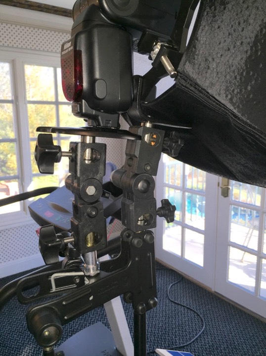 Here’s the clamp set-up I used. Notice that the clamp holding the speedlight is the same as for the large softbox