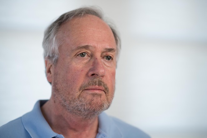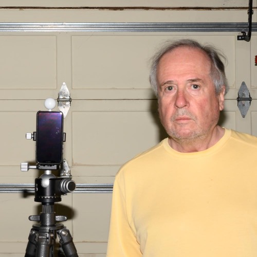I also tried an LED light, on the floor in front of the subject (me!) pointing up at 45 deg. Power was set to 75%, color temp 3900 deg K. This lit up the lower face and neck and gave a warm glow to the image.
