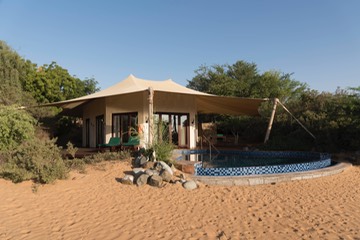 NGS have this trick that just when the going gets tough (about now), they take you to some fabulous resort for a couple of days of luxury. Well this was the day. We traveled on the bus for a couple of hours and arrived at the Al Maha Resort. Apart from being a luxury hotel, it is a nature reserve populated by Arabian Oryx, Gazelles and other interesting animals. It was clear as we drove through the sand dunes to get there that this would be a very special place. We were escorted to our rooms, individual bungalows with your own private pool. This was our room, overlooking a spectacular view of the sand dunes and desert.